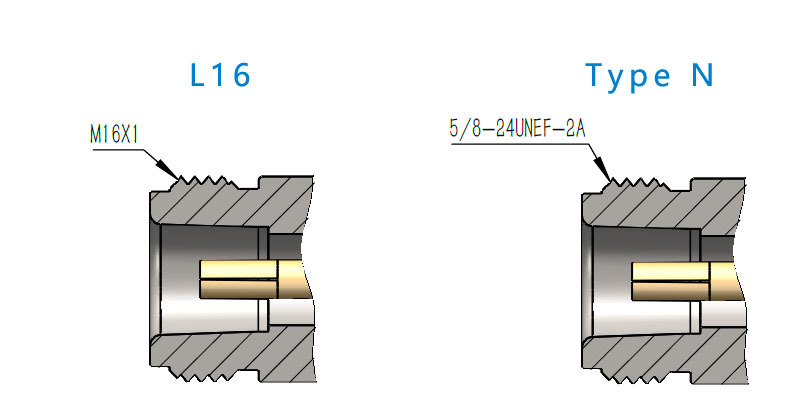 L16是一種(zhong)中國的(de)連接器(qì)産品,尺(chi)寸規格(ge)與N型連(lián)接器基(ji)本一緻(zhi),隻有螺(luó)紋标準(zhun)不同,N型(xíng)爲英制(zhì)螺紋5/8-24UNEF,而(er)L16爲公制(zhi)細牙螺(luo)紋M16X1,螺紋(wen)尺寸接(jie)近,但不(bú)完全兼(jiān)容。見下(xià)圖: