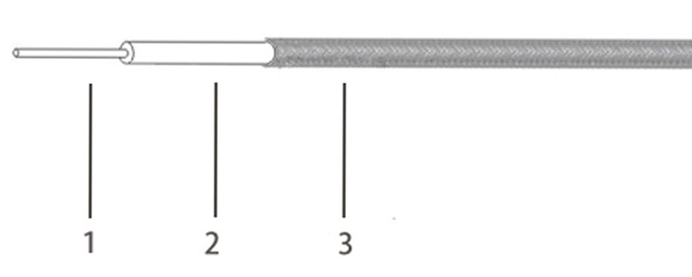 1.中心導體(tǐ)/銅鍍銀(單(dan)芯) 2.介質層(ceng)/PTFE 3.外導體/浸(jin)錫銅線編(bian)織(有的外(wài)面包覆FEP外(wai)護套) |